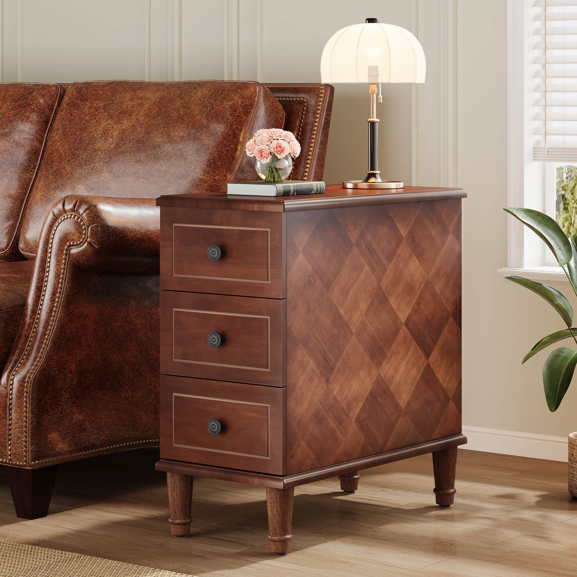 Lantine Side Tables with 3 Drawers, No Assembly Required, Narrow End Tables for Living Room, Nightstand Bedside Table for Bedroom, Walnut